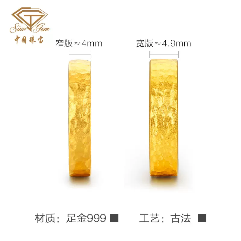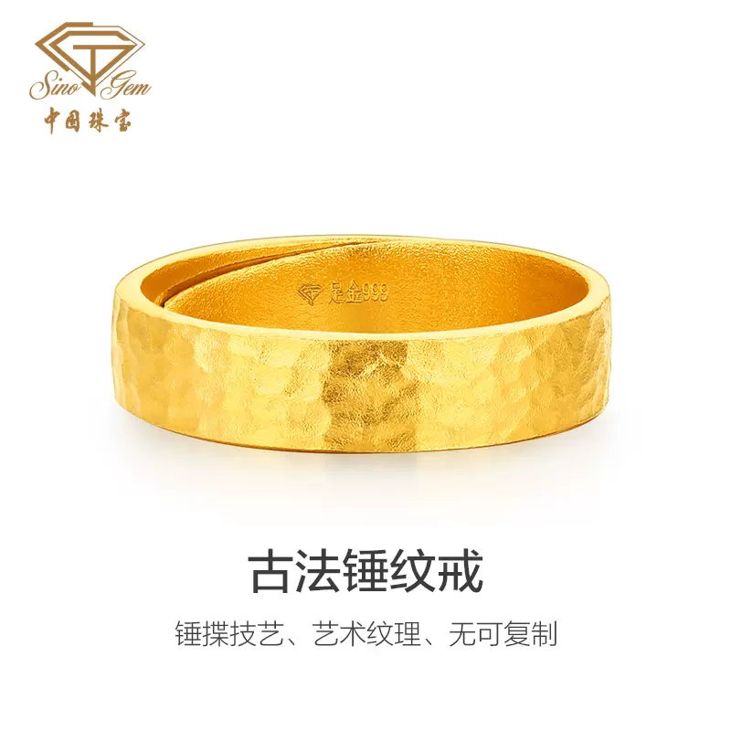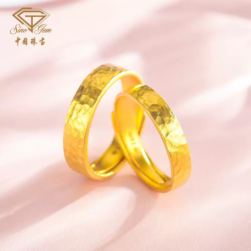 中国珠宝黄金新款情侣戒足金999古法金锤纹活口对戒结婚戒指礼物